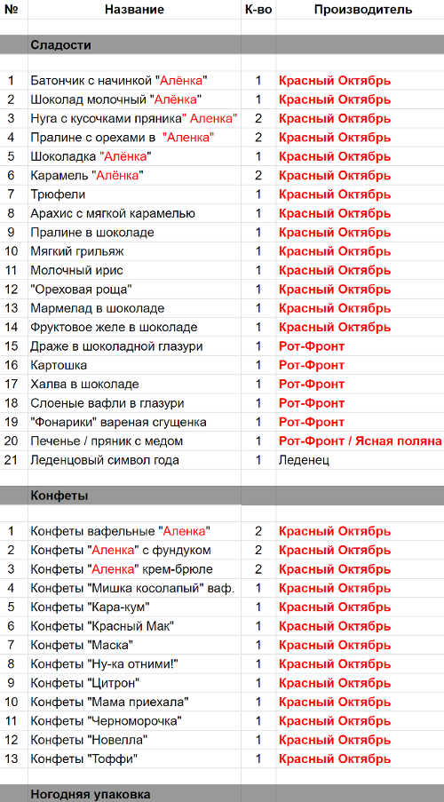 Батончик с начинкой "Алёнка" (1 шт), Шоколад молочный "Алёнка" (1 шт), Вафли с начинкой " Аленка" (2 шт), Пралине с орехами в  "Аленка" (2 шт), Шоколадка "Алёнка" (1 шт), Карамель "Алёнка" (2 шт), Трюфели (1 шт), Жареный арахис с карамелью (1 шт), Мягкий грильяж (1 шт), Молочный ирис (1 шт), "Ореховая роща" (1 шт), Мармелад в шоколаде (1 шт),  Фруктовое желе в шоколаде (1 шт), Конфеты вафельные "Аленка" (2 шт), Конфеты "Аленка" с фундуком (2 шт), Конфеты "Аленка" крем-брюле (2 шт), Конфеты "Мишка косолапый" ваф. (1 шт), Конфеты "Кара-кум" (1 шт), Конфеты "Красный Мак" (1 шт), Конфеты "Маска" (1 шт), Конфеты "Ну-ка отними!" (1 шт), Конфеты "Цитрон" (1 шт), Конфеты "Лебедушка" (1 шт), Конфеты "Черноморочка" (1 шт), Конфеты "Петушок" (1 шт), Конфеты "Toффи" (1 шт)