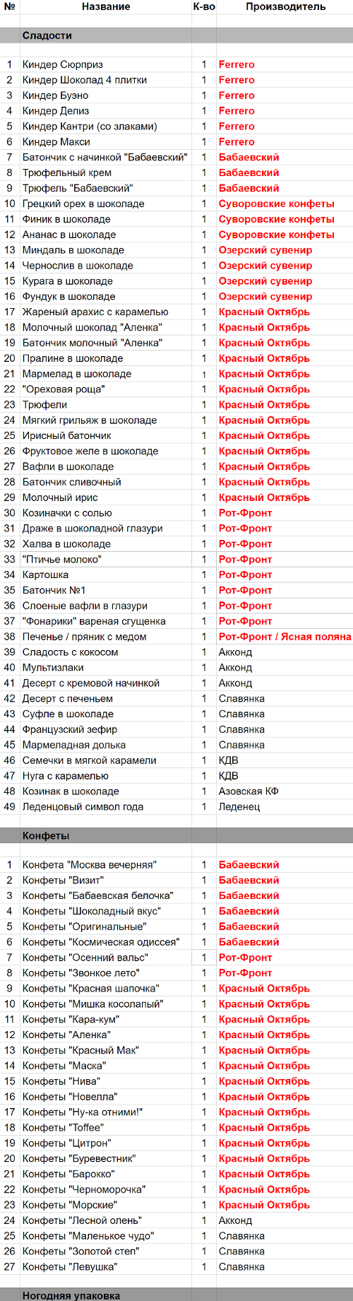 Жареный арахис с карамелью (1 шт), Молочный шоколад "Аленка" (1 шт), Батончик молочный "Аленка" (1 шт), Мармелад в шоколаде (1 шт), "Ореховая роща" (1 шт), Трюфели (1 шт), Мягкий грильяж в шоколаде (1 шт), Ирисный батончик (1 шт), Фруктовое желе в шоколаде (1 шт), Вафли в шоколаде (1 шт),Батончик сливочный (1 шт),  Молочный ирис ( шт), Конфета "Красная шапочка" (1 шт), Конфеты "Мишка косолапый" (1 шт), Конфеты "Кара-Кум" (1 шт), Конфеты "Алёнка" (1 шт), Конфеты "Красный мак" (1 шт), Конфета "Маска" (1 шт), Конфеты "Нива" (1 шт), Конфета "Петушок" (1 шт), Конфеты "Ну-ка отними!" (1 шт), Конфета "Toffee" (1 шт), Конфеты "Цитрон" (1 шт), Конфета "Буревестник" (1 шт), Конфеты "Барокко" (1 шт), Конфета "Черноморочка" (1 шт), Конфеты "Морские" (1 шт), Конфета "Мама приехала" (1 шт)